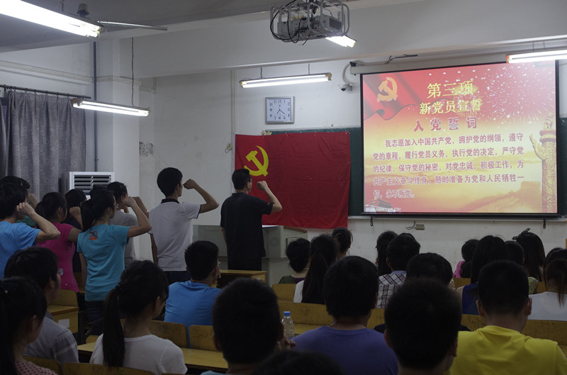 大会由舒建国书记主持,会议在嘹亮的国际歌歌声中拉开帷幕。首先,吴丽雯老师宣布了本次发展党员名单,随后,本次发展的28位新党员面对鲜艳的党旗,在领誓人舒书记的带领下进行了庄严的宣誓,会上,我们还邀请了本次发展的新党员周齐同学和即将毕业的优秀老党员黄靖同学做了代表发言,他们的发言再次重申了新时期党员的基本要求和当代老员工党员正确的理想追求,最后,施向荣书作了总结讲话,讲话中,施书记对新发展党员提出四点要求,一是要求同学们要进一步端正入党动机,加强党员的党性修养,二是要坚定共产主义理想信仰,并把这样的信念体现在具体的学习、工作与生活中,三是作为员工要加强自己的专业学习,充实自己,最后还要更好的发挥党员的模范带头作用,严格要求自己,规范行为,在今后的工作中不断进步。